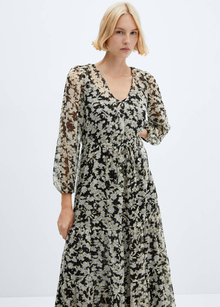 Ρευστό ύφασμα. Μίντι σχέδιο. Σχεδιασμός σε γραμμή Α. Λουλουδάτο σχέδιο. Λαιμόκοψη V. Μακριά μανίκια με ελαστικές μανσέτες. Ρυθμιζόμενο δέσιμο στη μέση. Χωρίς κλείσιμο. Εσωτερική φόδρα. Διαθέσιμο Plus