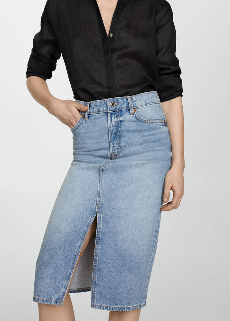 Βαμβακερό ύφασμα σε στυλ τζιν καουμπόι. Μίντι σχέδιο. Ίσιο σχέδιο. Θηλιές ζώνης. Πέντε τσέπες. Κλείσιμο με φερμουάρ και κουμπί. Άνοιγμα μπροστά στο στρίφωμα