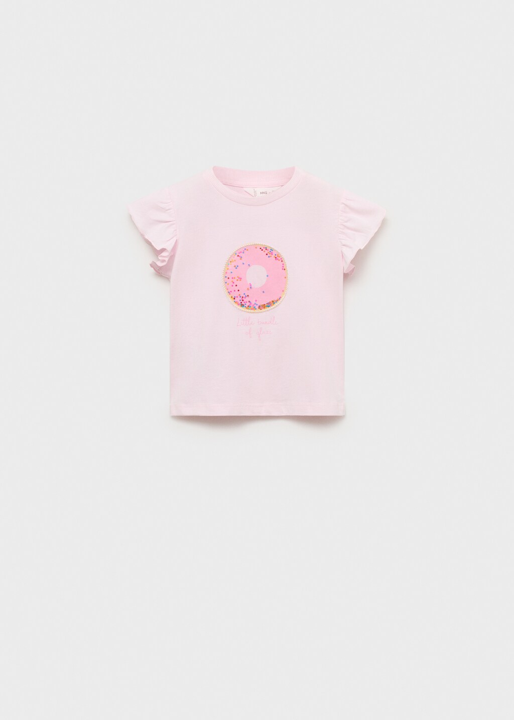 100% Βαμβάκι. Ίσια γραμμή. Σχέδιο με στάμπα. Στρογγυλή λαιμόκοψη με ριπ τελείωμα. Κοντό μανίκι με βολάν. Διακοσμητικές πούλιες.