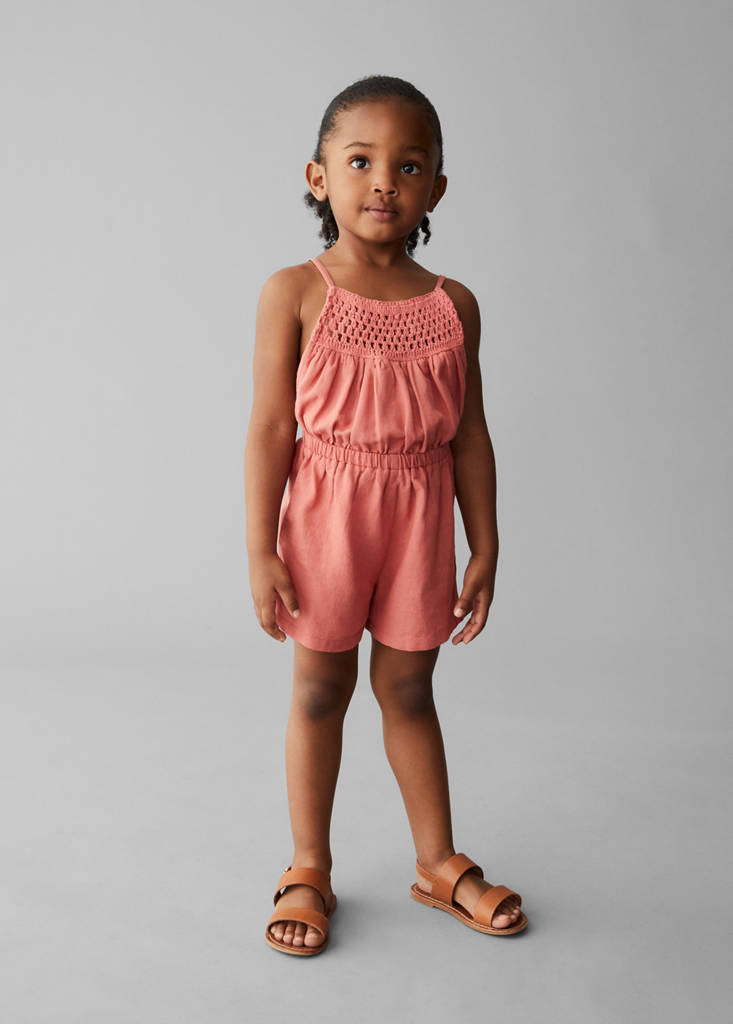 Ύφασμα μίξη βαμβακιού και βισκόζης. Κοντό σχέδιο. Λεπτές τιράντες. Λεπτομέρεια με βελονάκι. Ράντες χιαστί στην πλάτη. Ελαστική ζώνη. Στρογγυλή λαιμόκοψη. Χωρίς μανίκια. Χωρίς κλείσιμο. Αυτό το ρούχο είναι διαθέσιμο και στην κολεξιόν Woman. Αυτό το ρούχο είναι διαθέσιμο και στην κολεξιόν Kids Girl