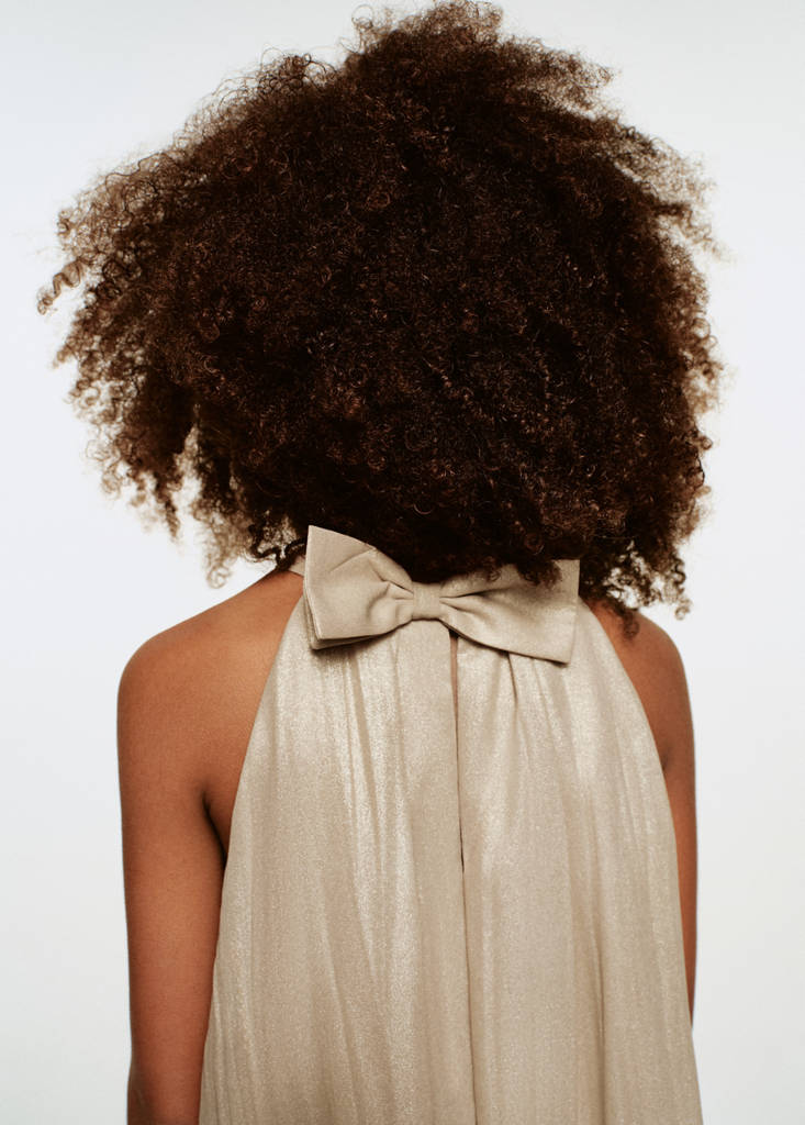 Μεταλιζέ ύφασμα. Κοντό σχέδιο. Στρογγυλή λαιμόκοψη. Χωρίς μανίκια. Λεπτομέρεια φιόγκος. Συλλογή για πάρτι και εκδηλώσεις