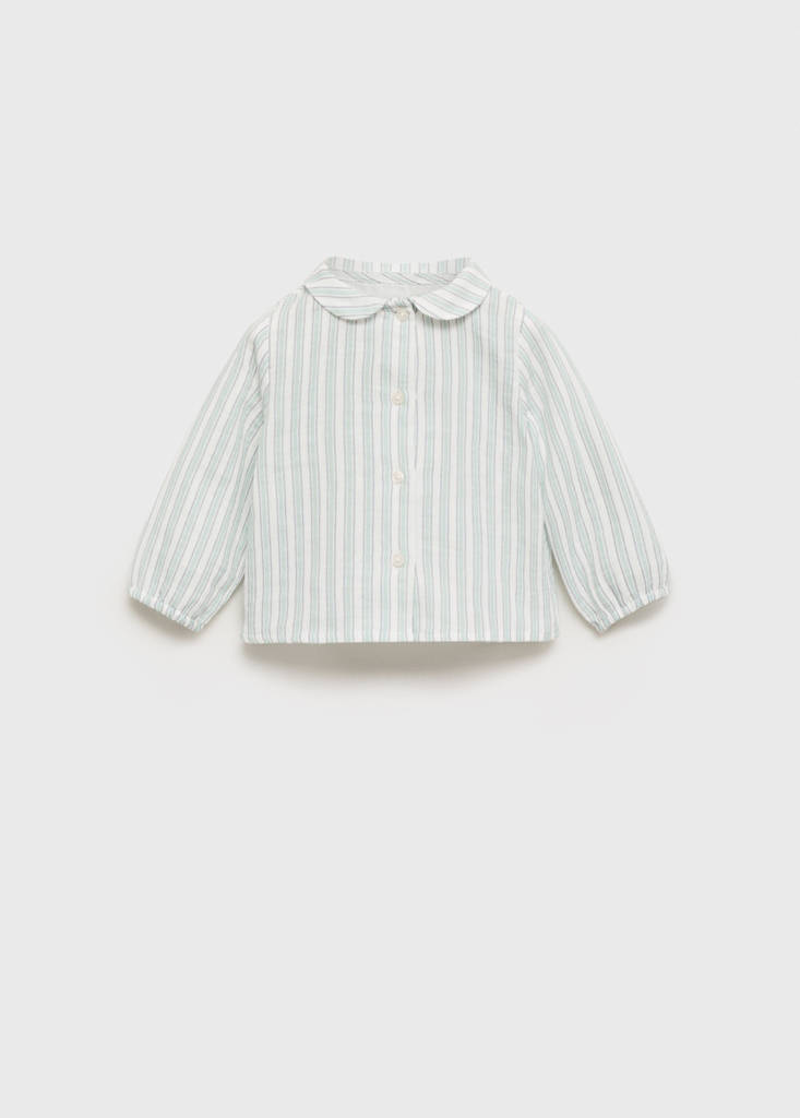 100% Βαμβάκι. Ύφασμα με εφέ μπαμπούλα. Ριγέ ύφασμα. Λαιμόκοψη babydoll. Μακρύ μανίκι. Ελαστικές μανσέτες. Μπροστινό κλείσιμο με κουμπιά