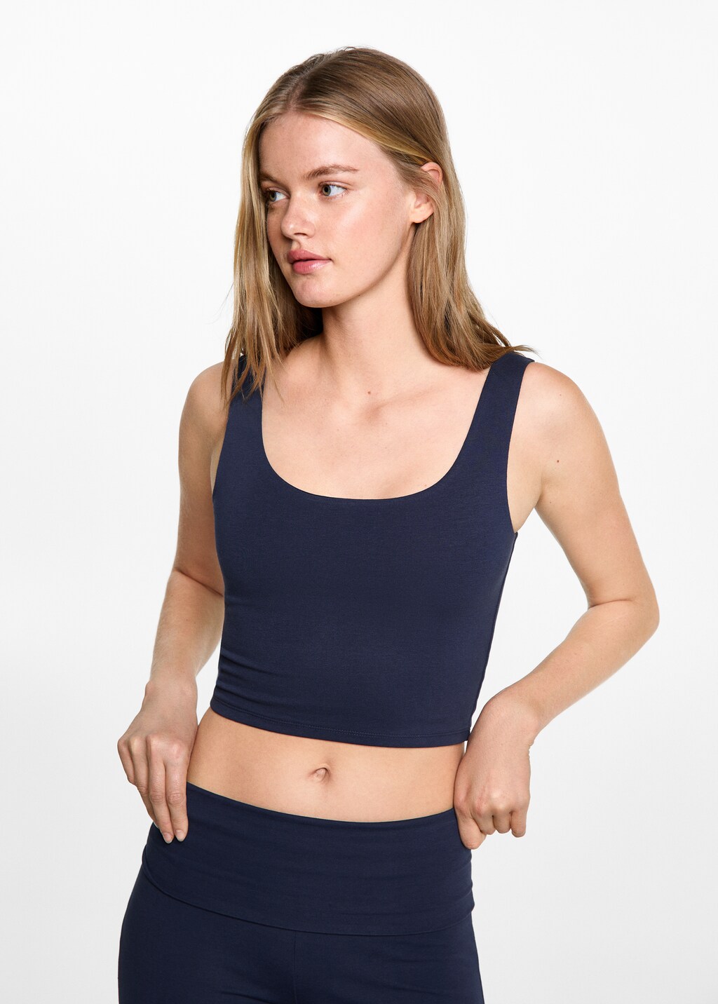 Ύφασμα με βαμβάκι. Ίσια γραμμή. Slim fit. Σχέδιο crop. Φαρδιές τιράντες. Στρογγυλή λαιμόκοψη. Η εικόνα του μοντέλου δημιουργήθηκε με τεχνητή νοημοσύνη.