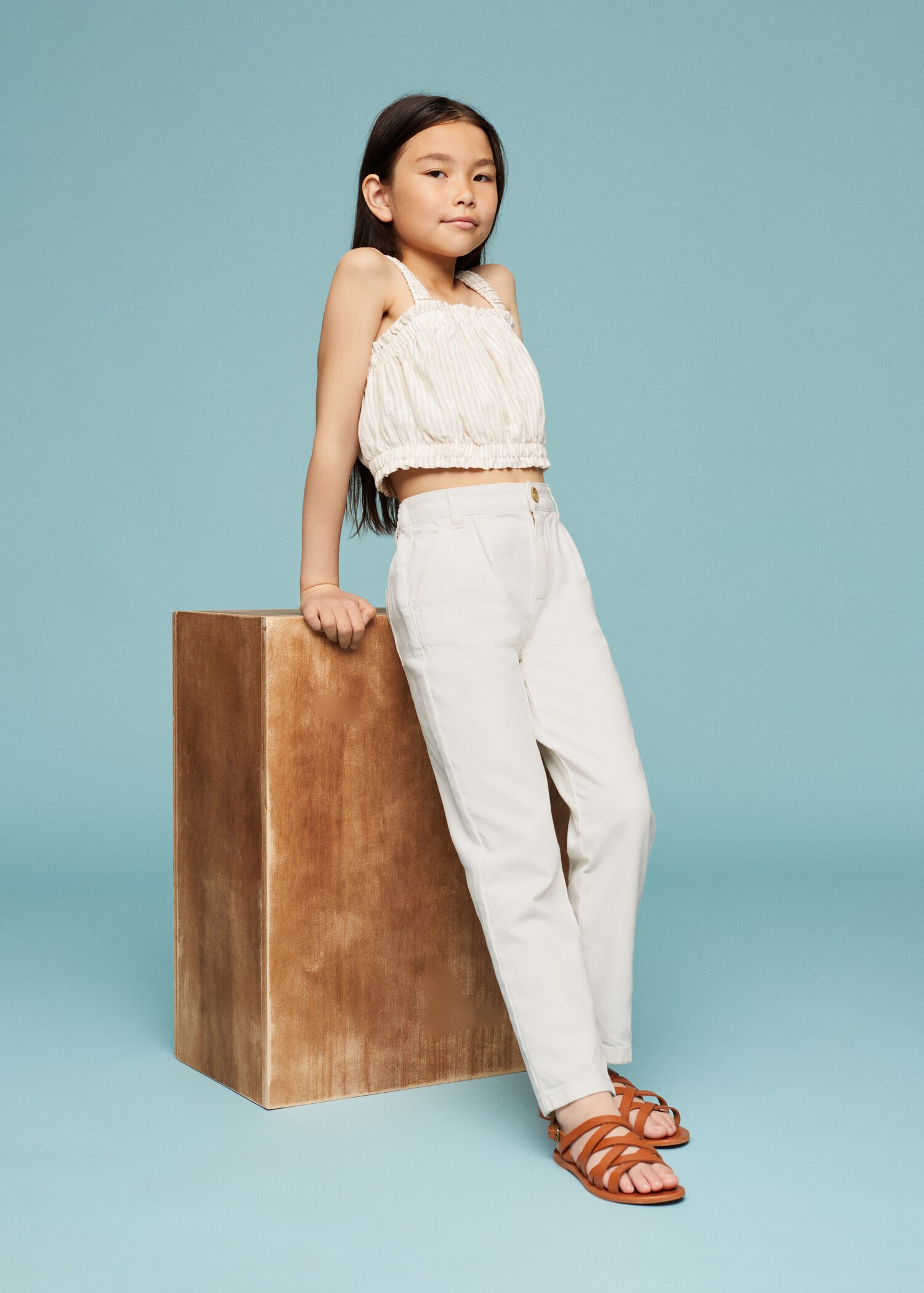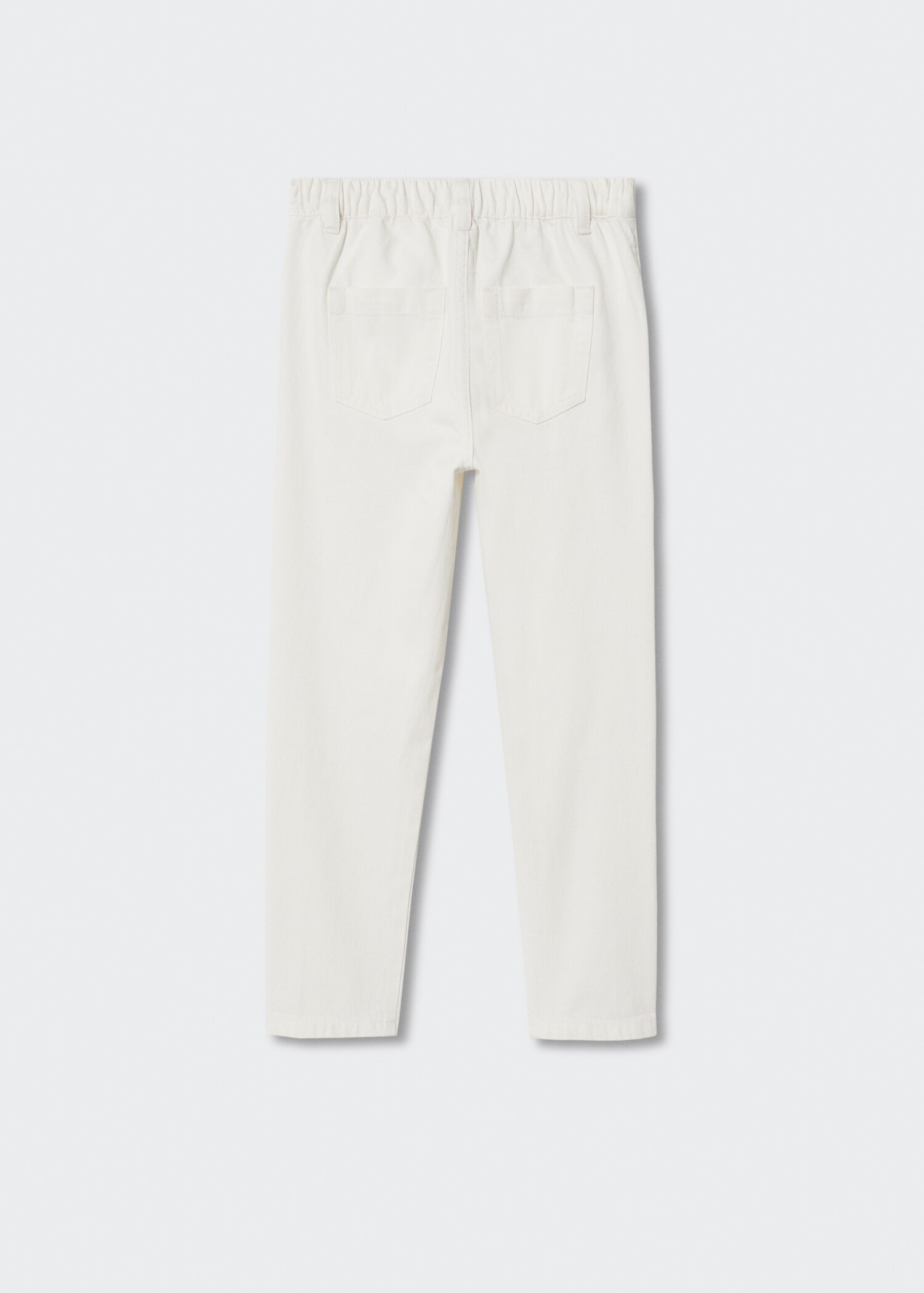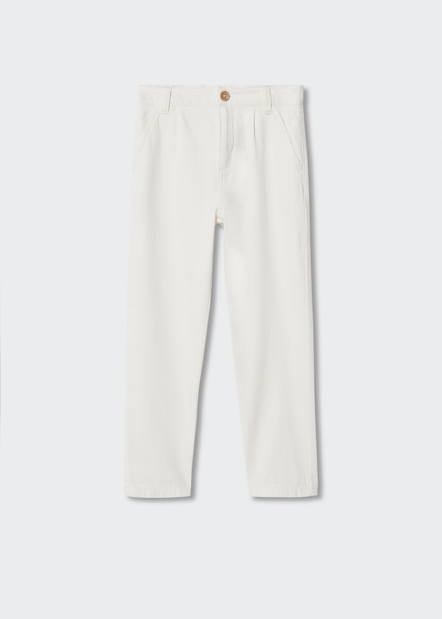 100% cotton fabric. Long design. High waist. Darts on the front. Straight design. Two side pockets. Two patch pockets on the back. Elastic back waistband. Zip and one button fastening. Fits bigger to size.