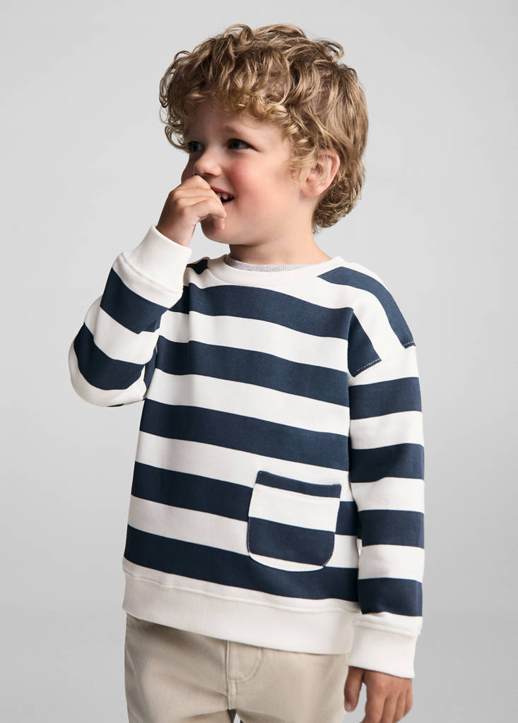 Striped print sweatshirtPrice historyInitial price struck through [12.99 € ]12.99 €Current price [9.99 € ]9.99 €-23%Select a colourDark NavySelect your size9-12 months (80cm)Not available. I want it!12-18 months (86cm)Not available. I want it!18-24 months (92cm)Not available. I want it!2-3 years (98cm)Not available. I want it!3-4 years (104cm)Not available. I want it!4-5 years (110cm)Not available. I want it!5-6 years (116cm)Not available. I want it!MeasurementsNotify meBack to school collection. Straight design. Striped print. Patch pocket. Round neck. Long sleeves. No FasteningDetails, composition and careStore availabilityItem qualitiesRecycled cottonAt least 20%This fibre is obtained from pre- and post-consumer textile waste that is transformed into new fabrics.