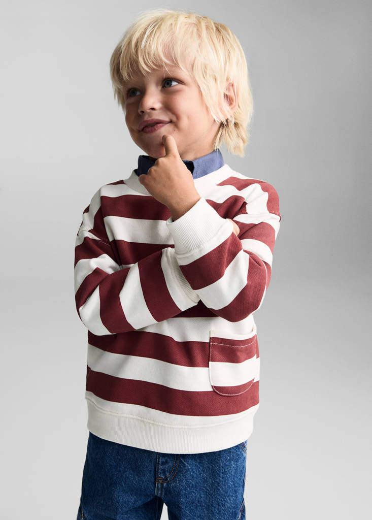 Striped print sweatshirtPrice historyInitial price struck through [12.99 € ]12.99 €Current price [9.99 € ]9.99 €-23%Select a colourMaroonSelect your size9-12 months (80cm)Not available. I want it!12-18 months (86cm)Not available. I want it!18-24 months (92cm)Not available. I want it!2-3 years (98cm)Not available. I want it!3-4 years (104cm)Not available. I want it!4-5 years (110cm)Not available. I want it!5-6 years (116cm)Not available. I want it!MeasurementsNotify meBack to school collection. Straight design. Striped print. Patch pocket. Round neck. Long sleeves. No FasteningDetails, composition and careStore availabilityItem qualitiesRecycled cottonAt least 20%This fibre is obtained from pre- and post-consumer textile waste that is transformed into new fabrics.