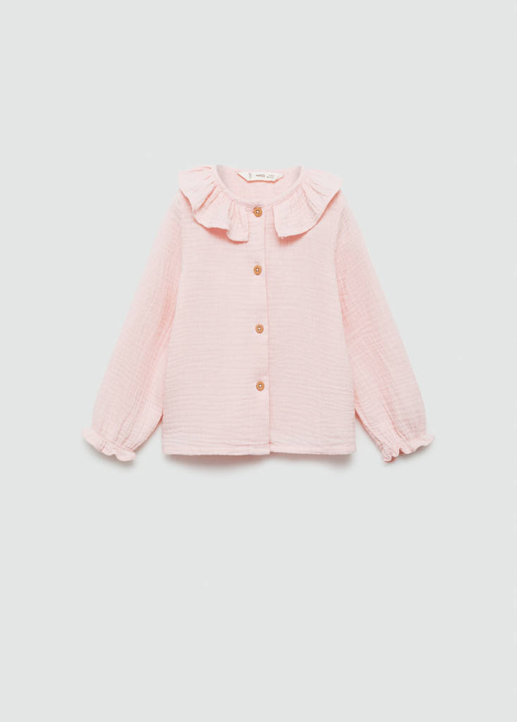 Cheesecloth cotton blousePrice historyInitial price struck through [17.99 € ]17.99 €Current price [13.99 € ]13.99 €-22%Select a colourPinkSelect your size9-12 months (80cm)Not available. I want it!12-18 months (86cm)Not available. I want it!18-24 months (92cm)Not available. I want it!2-3 years (98cm)Not available. I want it!3-4 years (104cm)Not available. I want it!4-5 years (110cm)Not available. I want it!5-6 years (116cm)Not available. I want it!MeasurementsNotify meBack to school collection. Bambula fabric. Straight design. Round neck. Ruffles detail on the neck. Ruffle detail. Front closure with buttonsDetails, composition and careStore availability