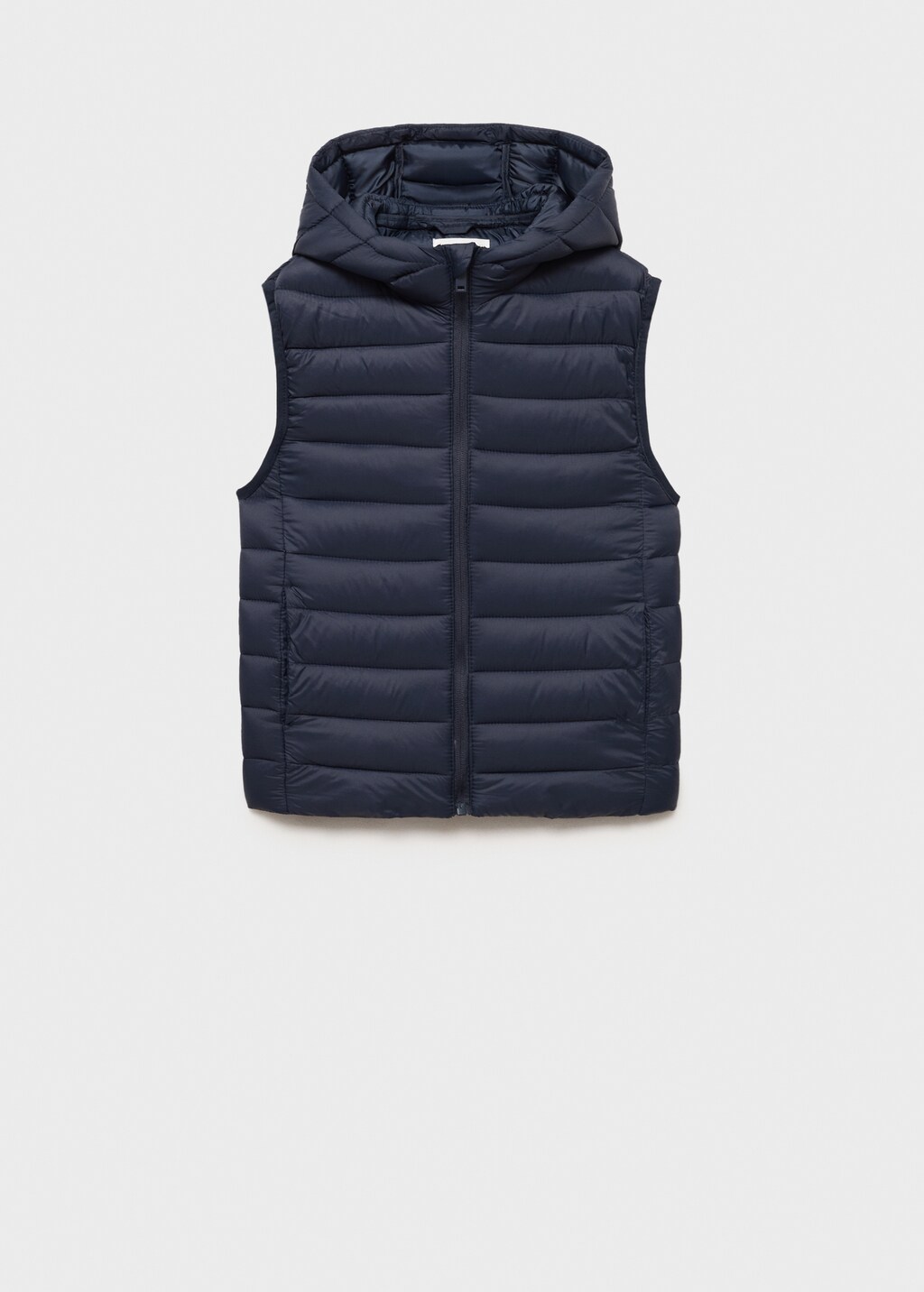 Straight Design. Inner lining. Quilted fabric. Two front pockets. Hood. High neck. Sleeveless. Front zip closure.