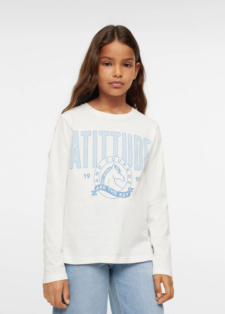 Long-sleeved t-shirt with messagePrice historyInitial price struck through [6.99 € ]6.99 €Current price [5.99 € ]5.99 €-14%Select a colourOff WhiteSelect your size5-6 years (116cm)Not available. I want it!7-8 years (128cm)Not available. I want it!9-10 years (140cm)Not available. I want it!11-12 years (152cm)Not available. I want it!13-14 years (164cm)Not available. I want it!DimensionsNotify me100% cotton fabric. Printed message. Rounded neck. Long sleeveDetails, composition and careStore availability