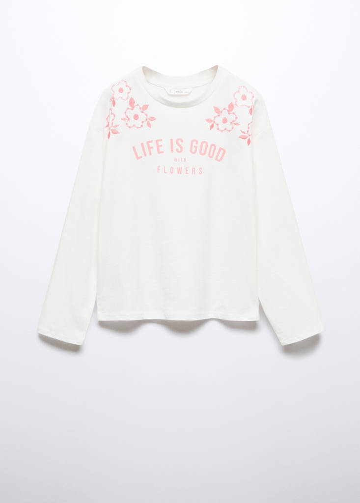 Printed message, straight design, embroidered draw, rounded neck, long sleeve.