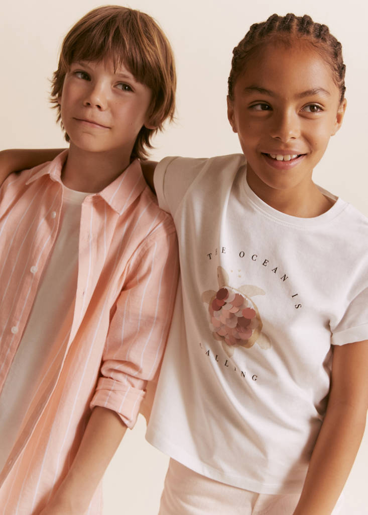 Image printed on the front. Straight design. Rounded neck. Short sleeve