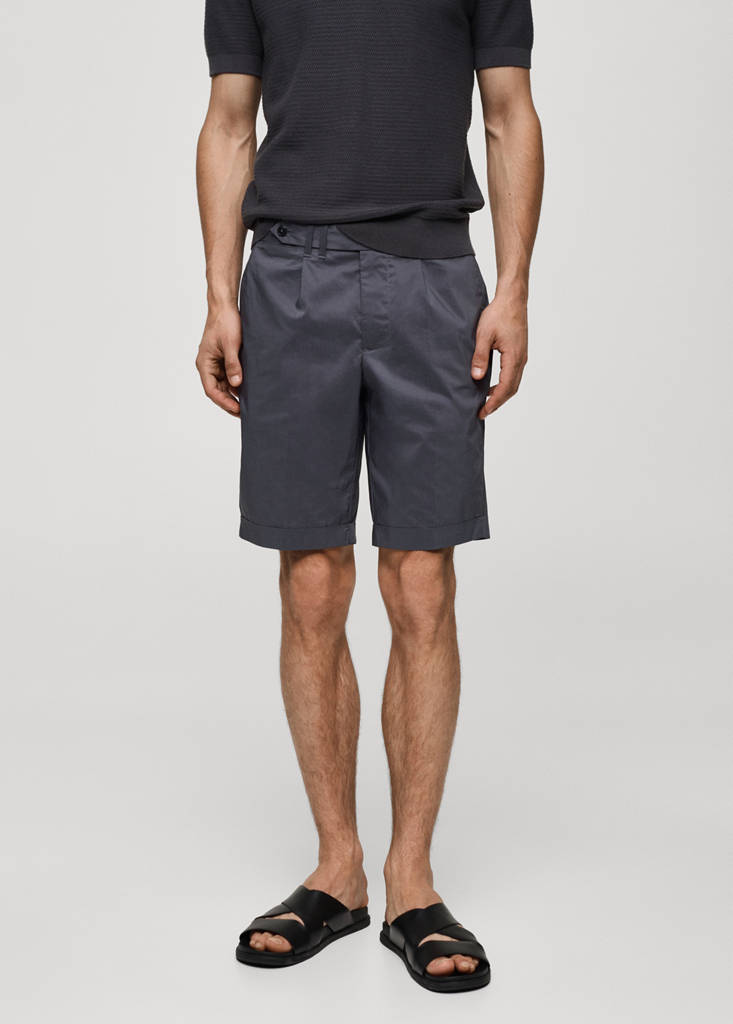 Cotton blend fabric. Front pleat detail. Belt loops. Concealed button, hook and zip fastening. Two front pockets. Two welt pockets with button at the back. Cuffed hem. Strap closure with button and double loop