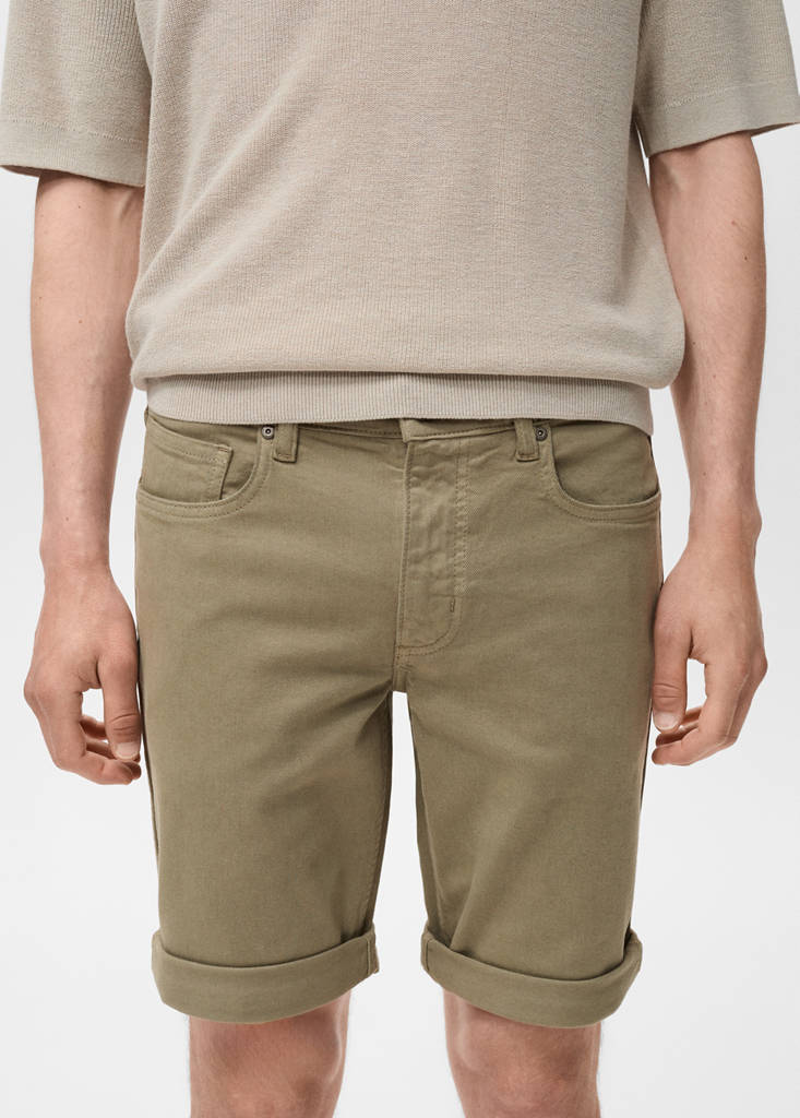 Crafted from cotton fabric, these slim-fit bermuda shorts feature belt loops and a button and zip fastening. They include two side pockets, a coin pocket, and two patch pockets at the back. The bermuda shorts have a hem at the bottom. The model is 190 cm tall and is wearing a size 42