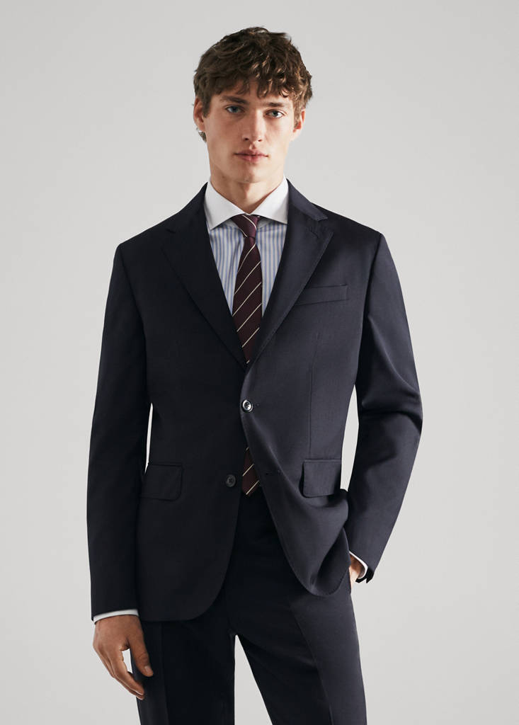 100% virgin wool. Italian fabric. Slim fit. Lapel with notch. Welt pocket on the chest. Front button closure. Two front flap pockets. Long buttoned sleeve. Double back slit. Straight hem. Inner lining. Three inside pockets. The model is 187 cm tall and is wearing a size 50. Tailoring collection. Antoine Griezmann Campaign