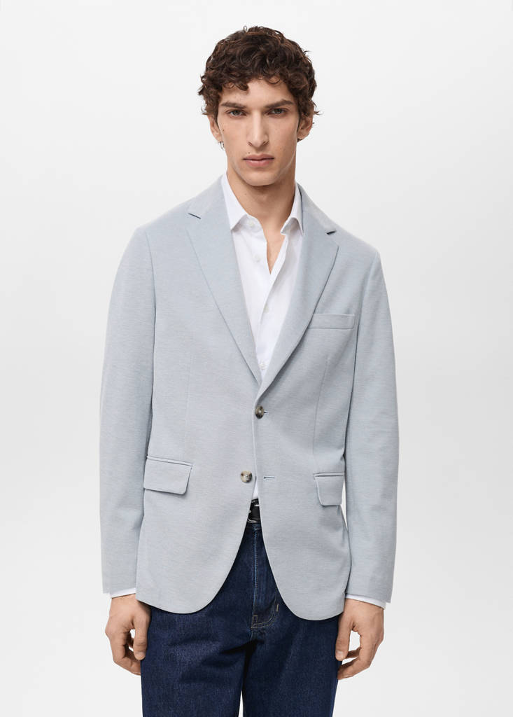 Tailoring collection. Slim fit. Cotton blend fabric. Lapel with notch. Button up. Chest welt pocket. Two welt and flap pockets on the front. Buttoned strap cuffs. Two openings at the back of the hem. Inside welt pocket