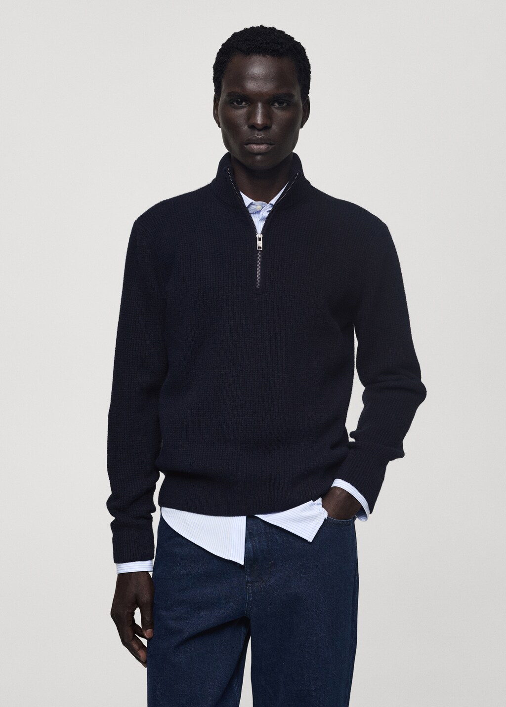 Knitted sweater with perkins neckPrice historyInitial price struck through [55.99 € ]55.99 €Current price [43.99 € ]43.99 €-21%Select a colourDark NavySelect your sizeSMLXLLast few items!XXLLast few items!Size guideAddDescriptionRegular fit. Midpoint. Recycled materials. Long sleeve. Perkins neck with zip. Ribbed finishes. The blue and white models are online exclusives.See detailsShare