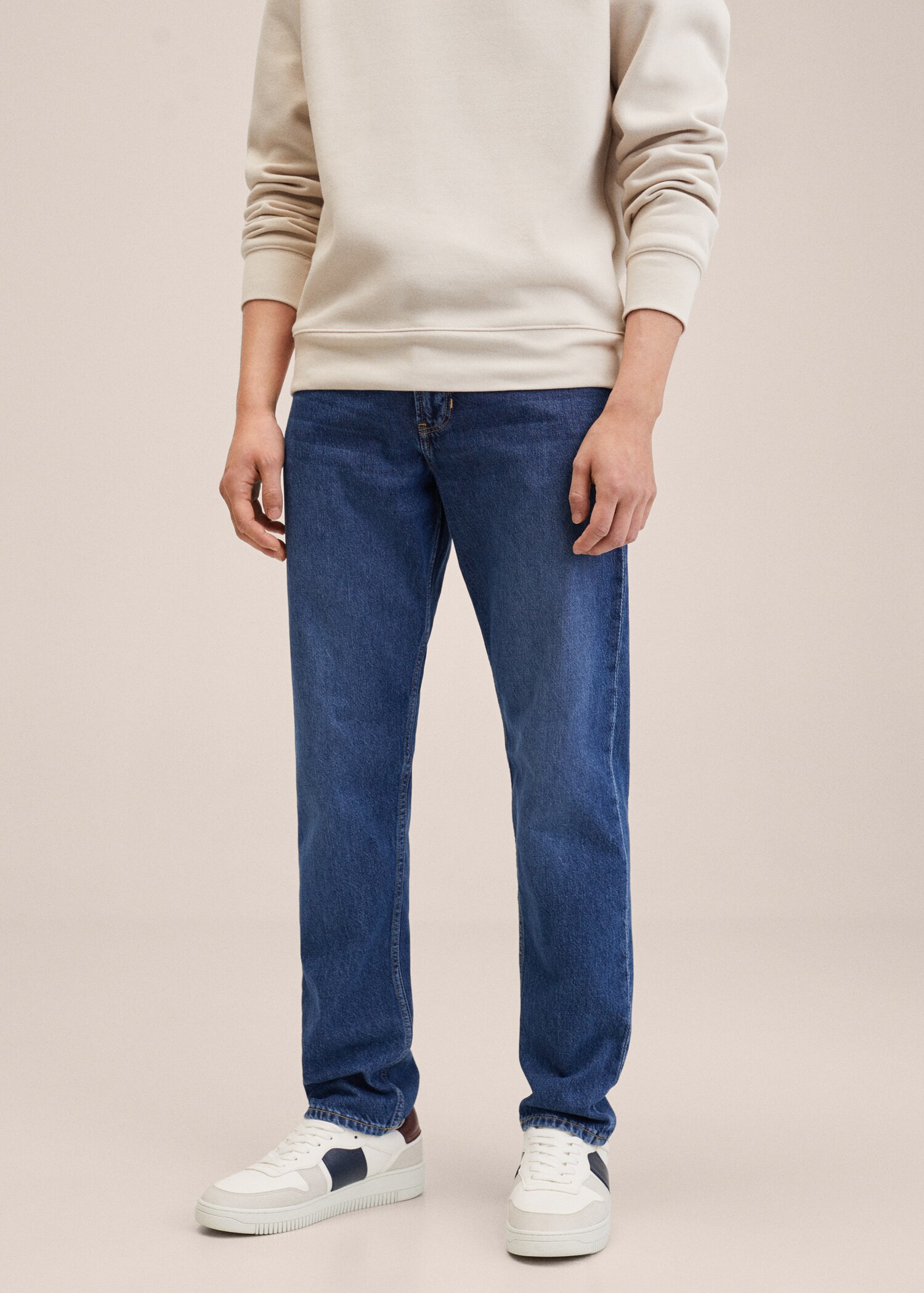 Straight-fit. Sustainable cotton fabric. Denim style cotton fabric. Dark wash. Straight fit. Loops. Zip and one button fastening. Five pockets. The model is 187 cm tall and is wearing a size 40.