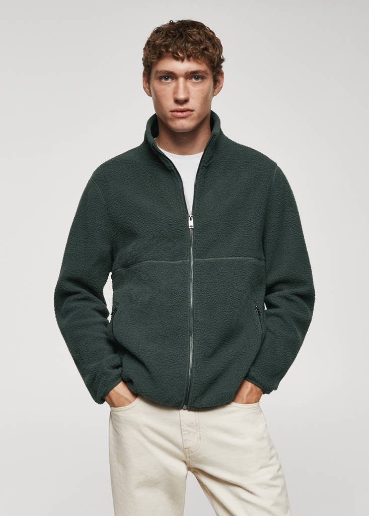 The blue colour is an online exclusive, polar fleece fabric, perkins collar with zip closure, backstitched details, long sleeve with elastic cuffs, straight hem, the model is 190 cm tall and is wearing a size M.