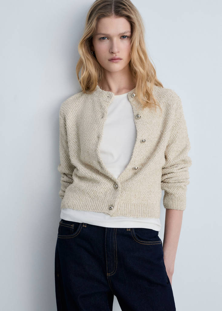 Chunky knit fabric. Straight design. Standard design. Round neck. Long sleeves. Front closure with buttons. Available Plus