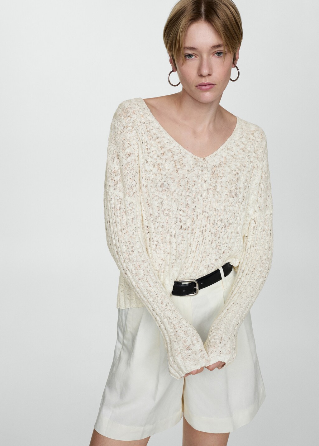 Cotton blend fabric. Chunky knit fabric. Semi-transparent design. Straight Design. V-neck. Long sleeve.