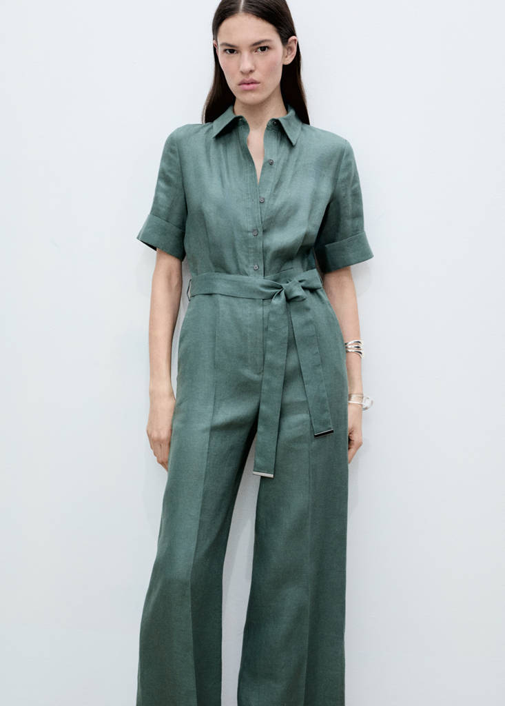 100% linen fabric. Long design. Straight design. Shirt collar. Short sleeves. Nightgown-style belt. Belt loops. Two side pockets. Front closure with buttons. Inner lining