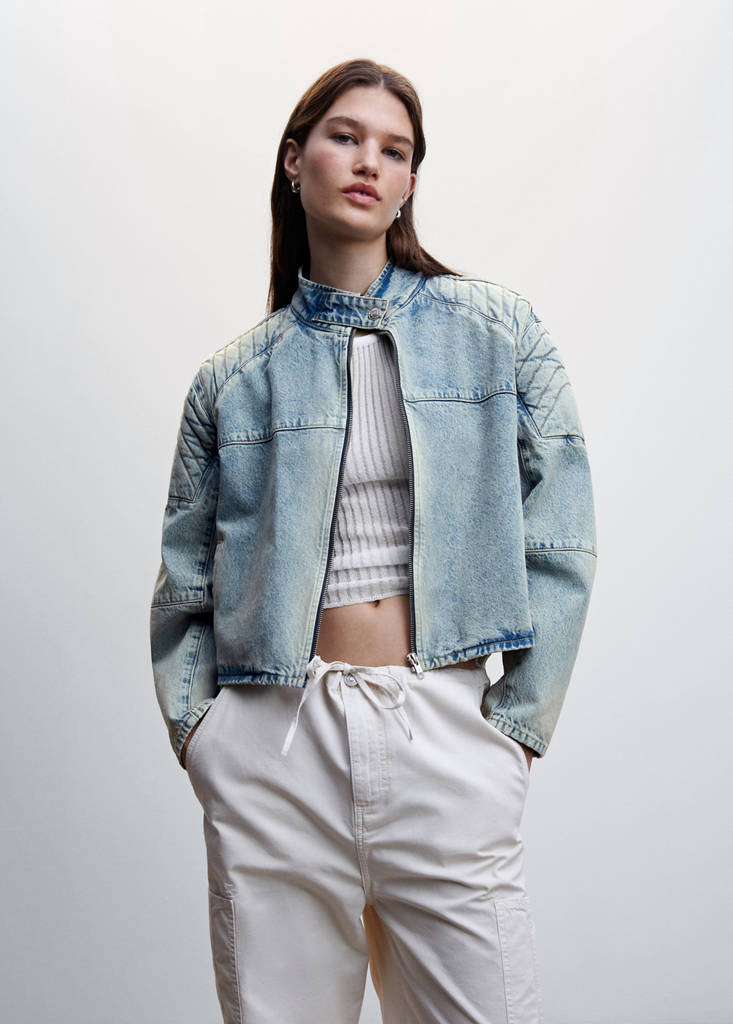 Denim style cotton fabric. Recycled cotton-blend fabric. Biker design. Straight design. Stand-up collar. Long sleeve. Zip fastening. One press stud fastening at the neck. Two side welt pockets. Contrasting panels. Decorative seams. Festival Season
