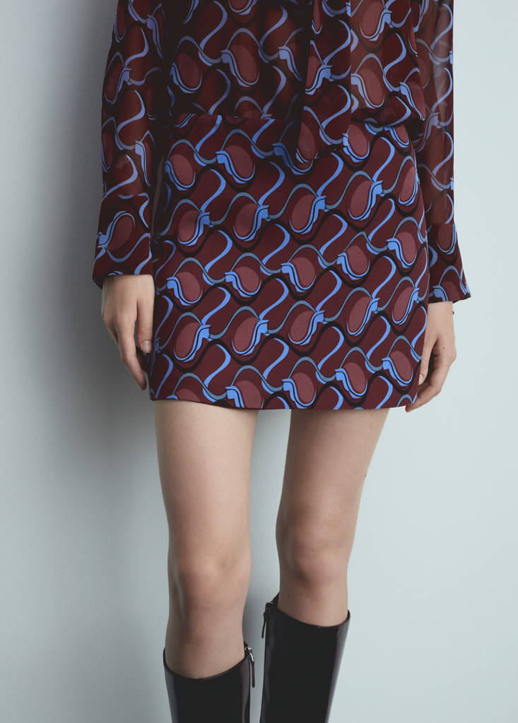 Fluid fabric. Short design. Straight design. Printed design. Invisible back zip fastening. Total look