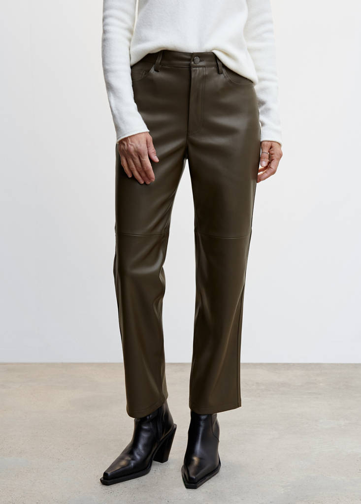 Faux leather. Crop design. Straight design. Mid-rise. Five pockets. Zip and button fastening. Belt loops. Decorative seams. Available Plus. Long design. The ecru colour is an online exclusive. Office looks