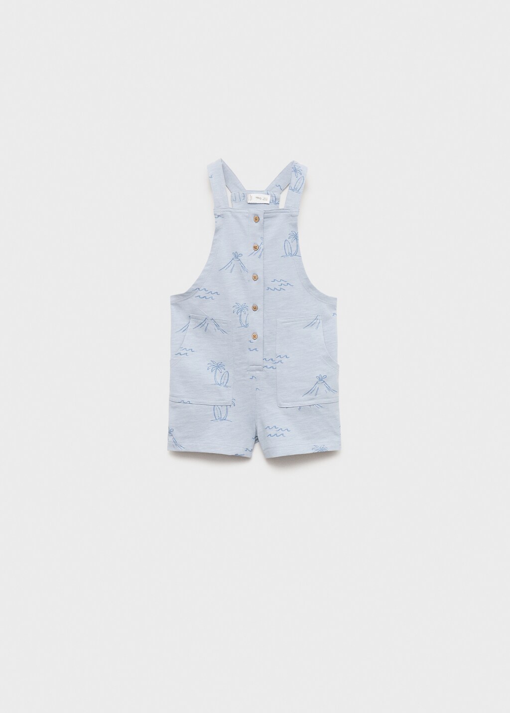 100% cotton fabric. Straight design. Short design. Palm tree print. Square neckline. Sleeveless. Wide straps. Two side pockets. Front closure with buttons