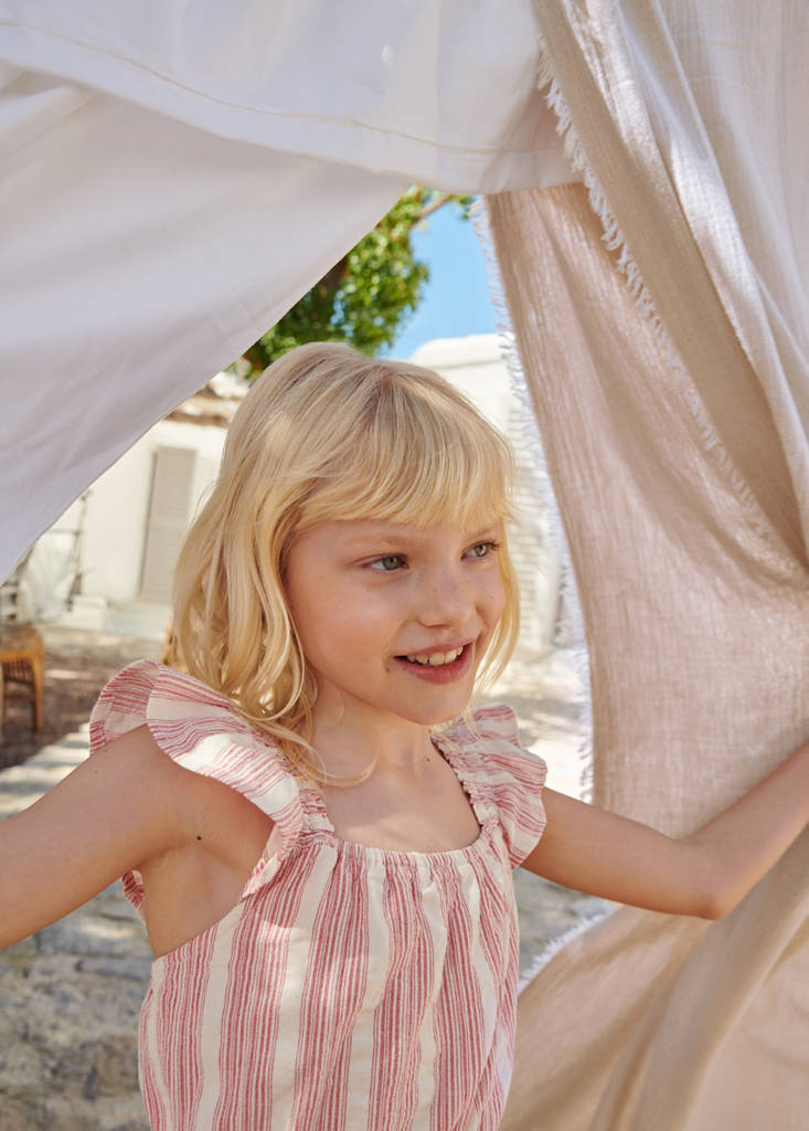 Striped print. Straight design. Long design. Elasticated waist. Ruffle details. Sleeveless. Unclosed