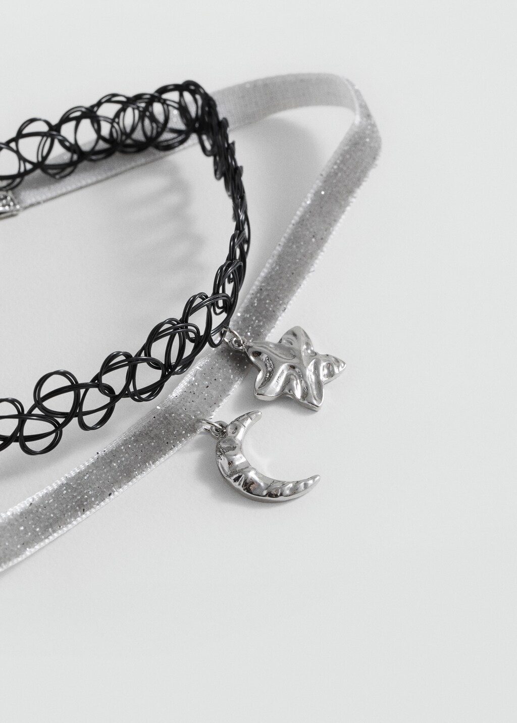 Pack of 2. Star pendant. Moon pendant. Stretch fabric. Zip and carabiner fastening.