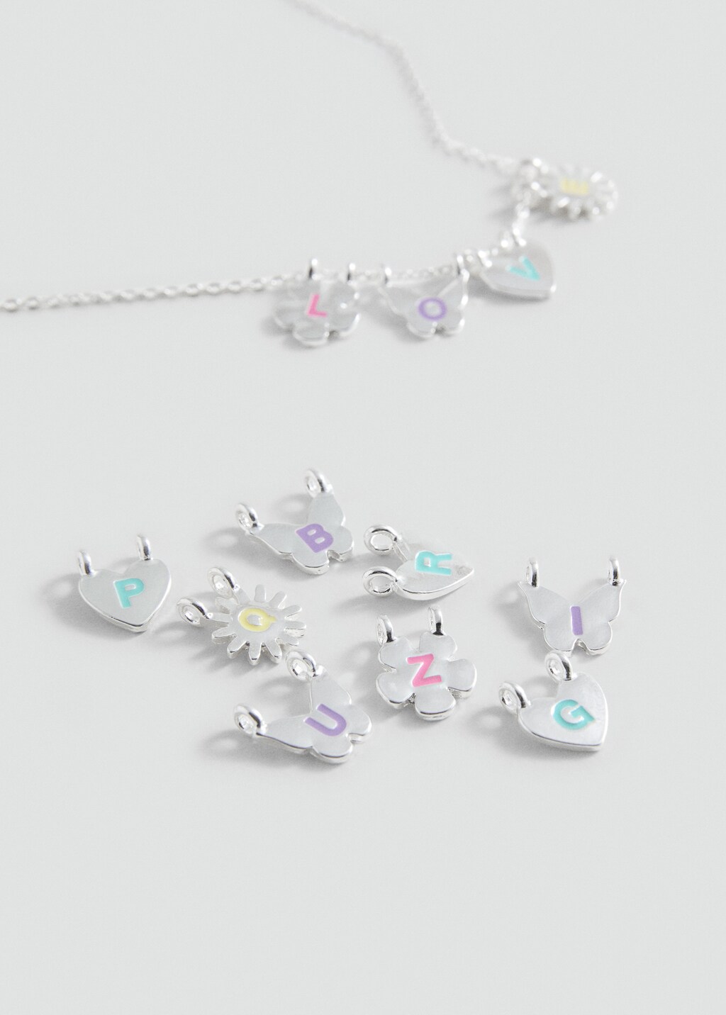 Fine metal chain. Letter beads. Zip and carabiner fastening.