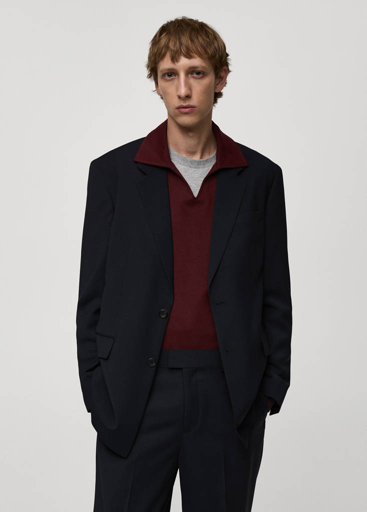 Regular fit. Wool mix fabric. Lapel with notch. Long sleeves with buttoned cuffs. Two-button fastening at the front. Inner pockets. Chest welt pocket. Two front flap pockets. Inner lining. Double back slit