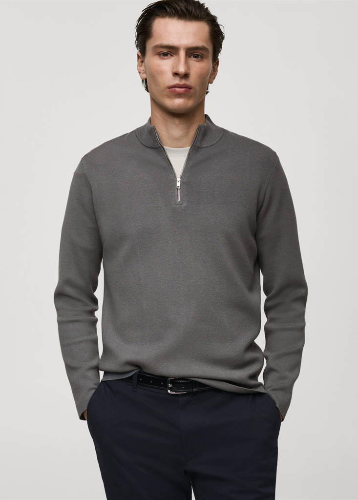 Regular fit. Fine knit fabric. Perkins neck with zip. Cable knit collar. Long sleeves. Straight hem