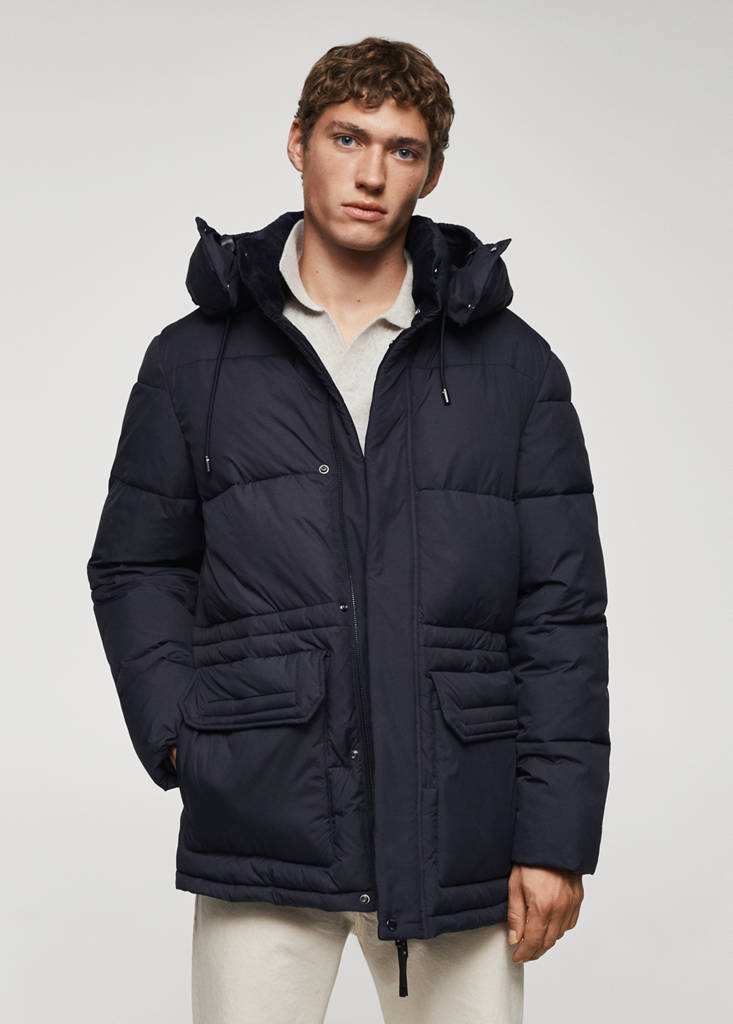 The anthracite grey model is an online exclusive. 100% recycled polyester. Waterproof fabric. Corduroy detail inside. Detachable hood. Front zip and snap button closure. Long sleeves. Two front flap pockets. Inner zipped pocket. Straight hem. Water-repellent: The durable finish of this garment protects against light rain, repelling contact with water and raindrops. Thermoregulating: This fabric offers optimal breathability to keep you at a stable temperature