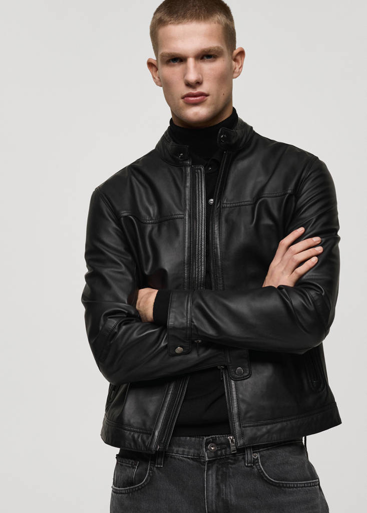 Medium. 100% nappa leather. Biker design. Short design. Quilted panels on the shoulders. Round neck with button closure. Zipped pockets on the front. Long sleeves with zipped cuff. Concealed zip fastening on the front. Inner lining. Interior pocket. Straight design. Front closure. Long sleeves. Mao neckline. Lining only. Medium design