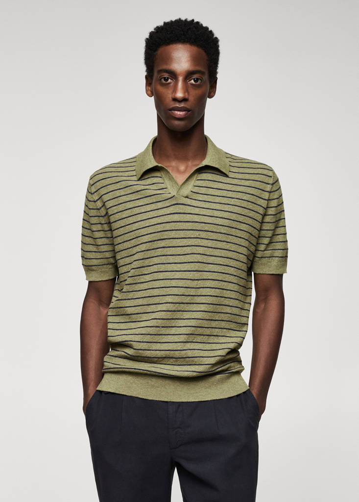 Fine knit fabric. Straight-fit. Horizontal stripe print. Polo neck. Buttonless collar. Short sleeve. Straight hem. Elastic finish. The model is 190 cm tall and is wearing a size M