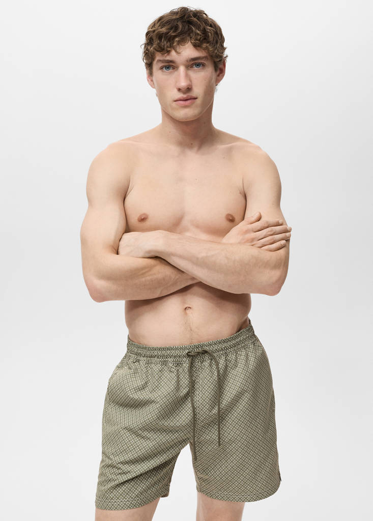 Relaxed fit. Geometric print. Elastic waist with adjustable drawstring. Two front pockets. Back patch pocket with Velcro. Small side slits on the hem