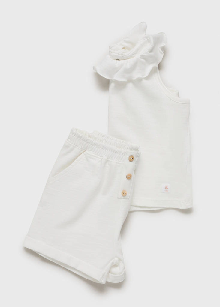 Ruffle-neck cotton t-shirtPrice historyInitial price struck through [9.99 € ]9.99 €Second price struck through [7.49 € ]7.49 €Current price [5.99 € ]5.99 €-40%Select a colourOff WhiteSelect your size1-3 months (62cm)Not available. I want it!3-6 months (68cm)6-9 months (74cm)Last few items!9-12 months (80cm)12-18 months (86cm)Last few items!18-24 months (92cm)Last few items!Add100% Cotton. Straight design. Ruffled round neck. Sleeveless. Press-stud fastening at the back. Total lookDetails, composition and careStore availabilityItem qualitiesRecycled cottonAt least 20%This fibre is obtained from pre- and post-consumer textile waste that is transformed into new fabrics.