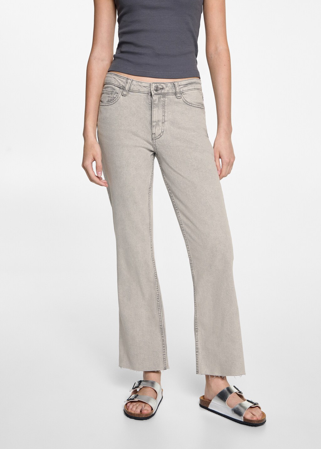 Denim-style cotton fabric. Flare design. Five pockets. Zip and button fastening. Frayed finish.