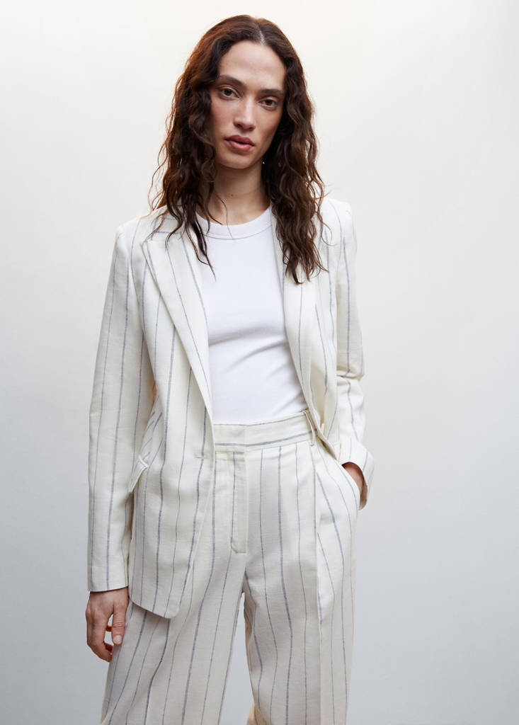 Cotton and linen mix. Straight design. Striped design. Lapel-collar V-neck collar. Long sleeve. Two pockets with flaps. Button fastening on the front. Co-ord