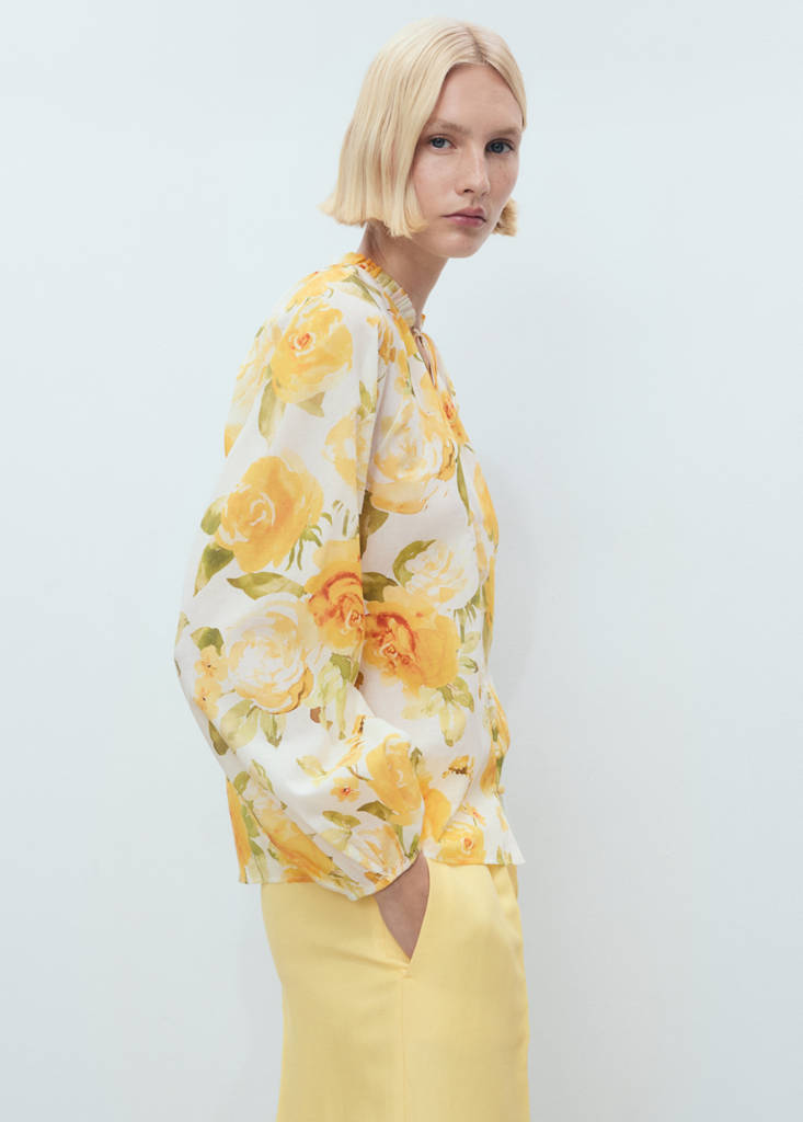 100% cotton fabric. Straight design. Semi-transparent design. Floral print. Round neck with drawstring. V-neckline. Long sleeves. Puffed sleeves. Button fastening at the front