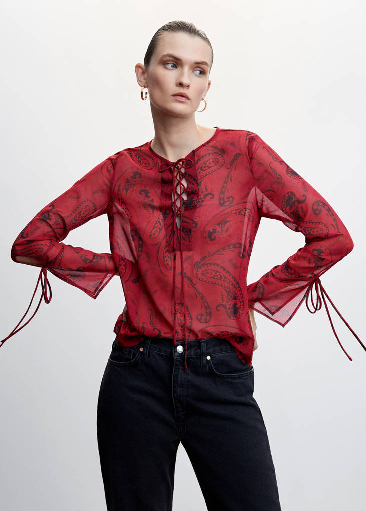 Straight design. Flowy fabric. Paisley print. Sheer fabric. Rounded neck. Bow fastening on the neck. Long flared sleeve. Cuff ties detail