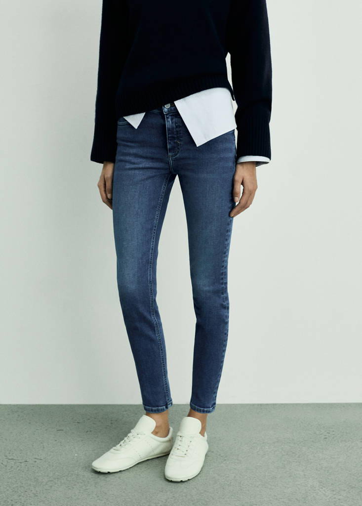 Denim-style cotton fabric. Medium. Mid-rise. Skinny fit. Long design. Five pockets. Belt loops. Zip and button fastening. Ankle brace. Available Plus. Inseam 68 cm