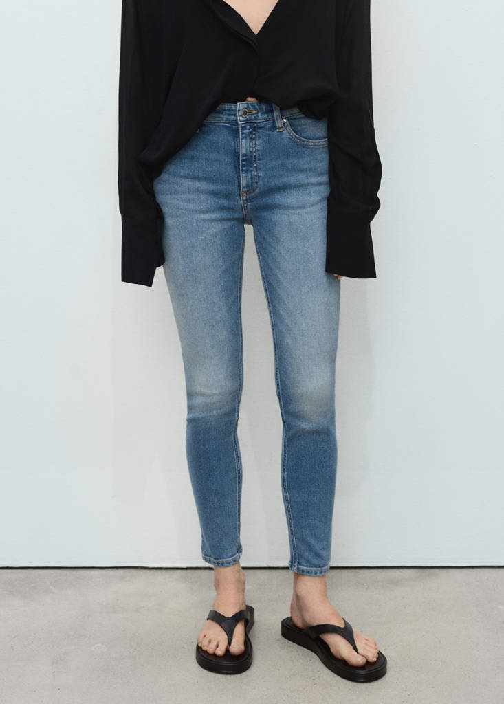 Denim-style cotton fabric. Stretch fabric. Long design. Skinny fit. Mid-rise. Belt loops. Five pockets. Front zipper and button closure. Available Plus
