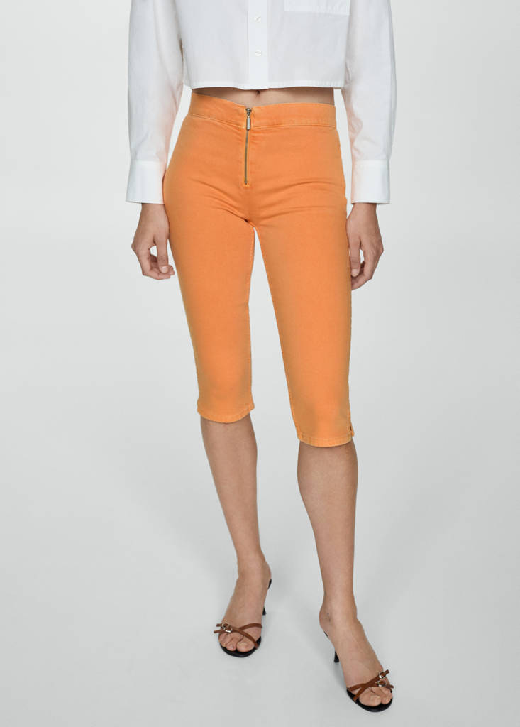 Denim-style cotton fabric. Capri design. Skinny fit. Mid-rise. Belt loops. Two patch pockets at the back. Front zip closure. Interior length 43.5 cm