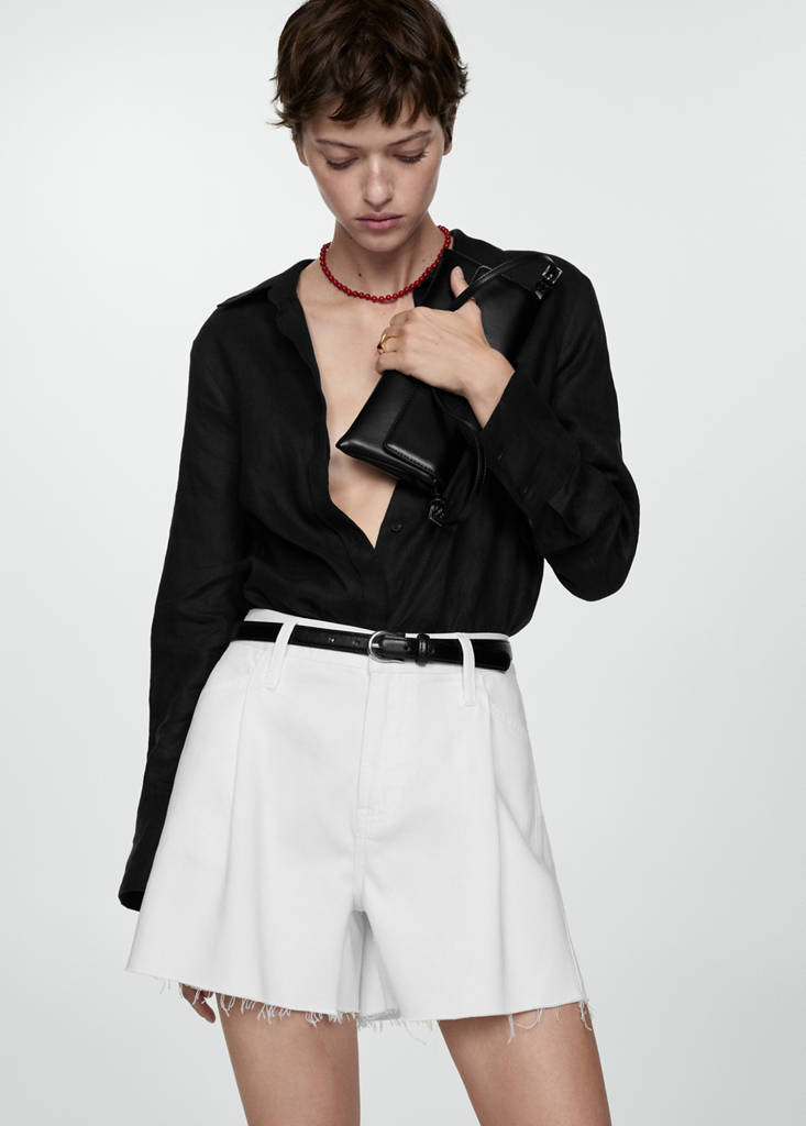 Denim-style cotton fabric. Straight design. Short design. Two front pockets. Two patch pockets at the back. Belt loops. Dart detail. Frayed hem. Front zip and button closure