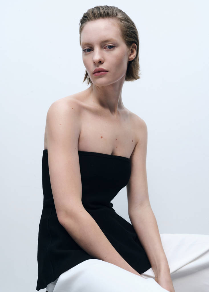 Fine knit fabric. Peplum design. Bandeau design. Strapless. Off shoulders. No Fastening. Party, ceremony and communion collection. Total look. This garment belongs to our event collection, designed to make you the perfect guest at any party, wedding or ceremony