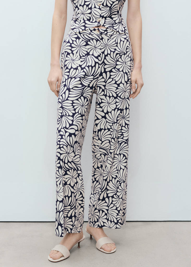 Linen mix. Long design. Straight design. Flowers print. Mid-rise. Belt loops. Two side pockets. Front zipper and button closure. Total look. Available Plus