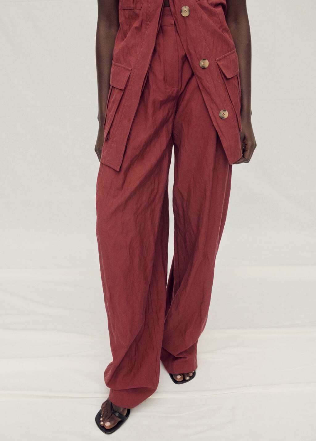 Cotton blend fabric. Suit style. Wrinkled effect. Long design. Wide-leg design. Low waist. Belt loops. Two side pockets. Two welt pockets at the back. Concealed button, hook and zip front closure with placket. Total look. Selection Collection.